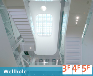 Abundant natural light shines in from above to ensure sufficient lighting and conserve energy. The wellhole provides an open atmosphere for the office floors where a large number of people gather.