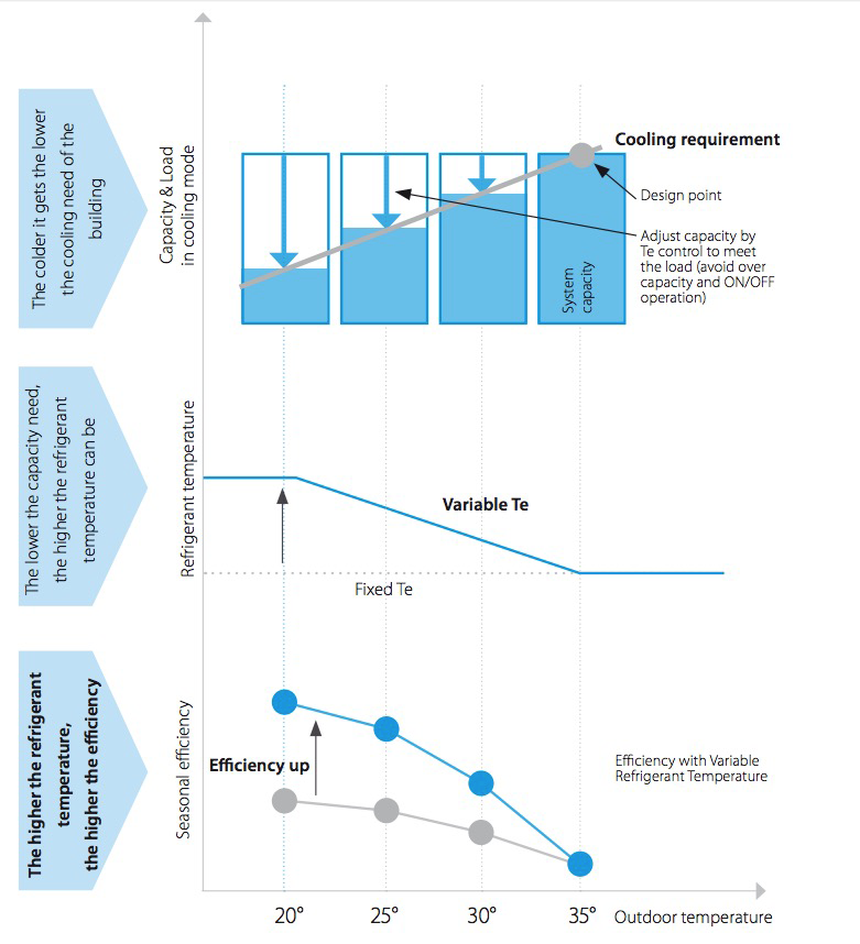 Variable Refrigerant Temperature automatically adjusts your system to meet individual building and climate requirements, while significantly cutting energy costs and improving comfort. To achieve the highest levels of seasonal efficiency, the system's capacity is controlled via the inverter compressor and by varying the evaporating (Te) and condensing (Tc) temperature of the refrigerant.